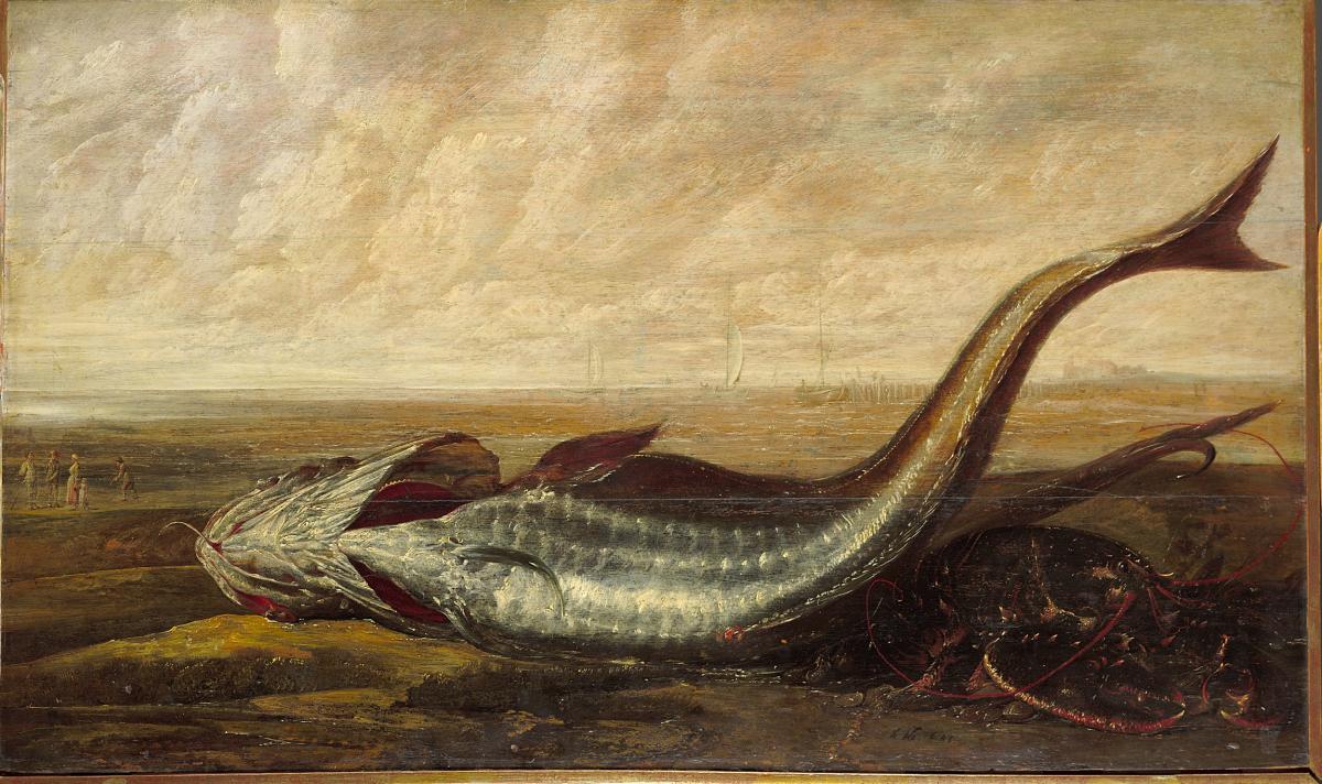 Although better known for his peasant scenes or more lavish still lifes, this close-up of a cod is a rarity in the oeuvre of François Rijckhals, a 17th-century painter of the Dutch school who worked in Middelburg (Zeeland). Apart from this one, only two other similar paintings by his hand have survived, all executed around 1642–43. This Cod on the Beach can be compared to other compositions of the period depicting freshly caught fish laid out on the shore, with a lively landscape in the background, sometimes painted by a second artist specialising in that genre. But Rijckhals distinguishes himself from painters such as Jan Van Kessel I or Willem Ormea through his choice of an original scale: the single fish, a cod, appears disproportionately large compared to the figures on the beach, the distant silhouette of buildings and the maritime activity in the background. Note here the reversal of the academic hierarchy of pictorial genres, which traditionally places history painting and the human figure above landscape and still life. Although this subject was not his speciality, Rijckhals demonstrates great mastery in detailing the anatomical features of the cod – its gills, scales, and barbels on its chin… The inclusion, in the bottom right-hand corner, of a lobster—a crustacean that always appears alongside the fish in Rijckhals’s work—allows him to add red to his palette, which is otherwise dominated by brown, ochre and grey tones. Between the two animals lies a gaff, with its hook used to haul large fish out of the water. These various elements can be interpreted as Christian symbols (the fish for Christ, the lobster for the Resurrection, the gaff for the Holy Lance), but such a still life should primarily be regarded for its high decorative value, celebrating fish and fishing, emblematic of the diet and economy of the United Provinces.