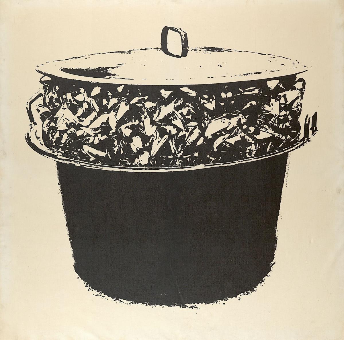 The photograph on sensitised canvas of the Mussel Casserole in our collections reflects those objects denied the status of works of art. A trivial reference to Belgian identity and the bourgeois taste for good food, it alludes to what is usually regarded, with a certain contempt, as mass culture. The artist thus deliberately confounds intellectuals and aesthetes. There are technical similarities between this canvas and American Pop Art works, but the banal two-tone colour scheme and the poor quality of the photograph used show that Broodthaers, unlike his colleagues across the Atlantic, denies any artistic value to the object or its image.