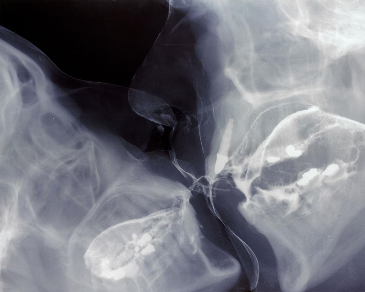 Captured in an X-ray, a couple are kissing. Their two chins overlap, adding depth to the transparency of the outlined face. In this *Kiss 5*, whilst exploring the themes of love and sexuality, Wim Delvoye shows us what we cannot see: the interior of the body and its functions. As in his famous Cloaca, a work that reproduces the human digestive system, he reveals the internal structures of the body and displays details as mundane as fillings or dental implants. This contemporary Belgian artist is one of the most recognised today. Here, he tackles a romantic theme with provocation and derision. Above all, he expresses a relationship with reality characteristic of Belgian art, with this contrast between a representation intended to be erotic and the anatomy of skulls that symbolise death. The depiction of skeletons and skulls, known as Vanitas, is an iconographic tradition inherited from the Renaissance and more particularly from the Baroque period. It has fascinated artists such as James Ensor and Delvaux. The skulls inserted into the still lifes suggested that human existence is vain and fleeting. Wim Delvoye’s Kiss series displays the pleasures of life and love, but in the manner of a memento mori, ‘remember that you will die’.