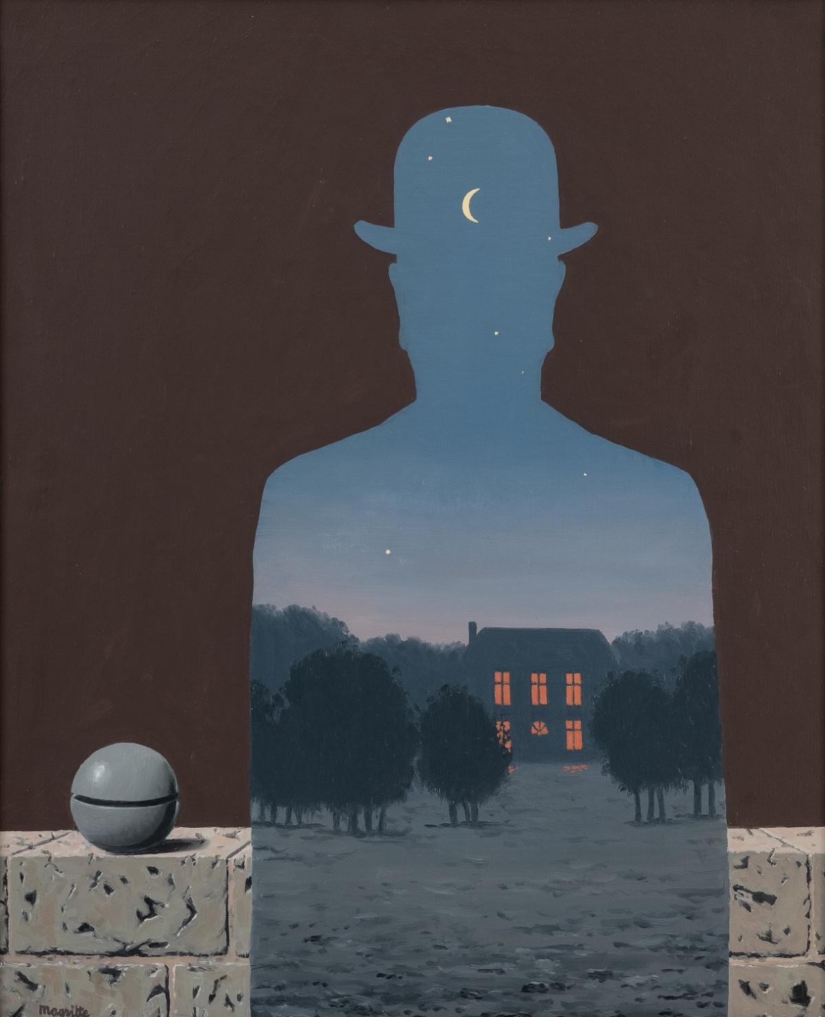 The Happy Donor features several of the artist’s ‘classic’ elements: the figure of the man in the bowler hat is set against a nocturnal landscape, creating a play of light that contrasts with the interior of the house; the bell is positioned on a low wall in the foreground. The title is thought to allude to the kindness of Jean Coquelet, curator of the Musée d’Ixelles from 1957 to 1987. In 1966, the year before his death, Magritte, grateful to the curator for organising the first retrospective dedicated to him in 1959, allowed the museum to acquire the painting *The Happy Donor* for a modest sum. Both ambiguous and straightforward to interpret, this work is considered one of the masterpieces in the museum’s collections.