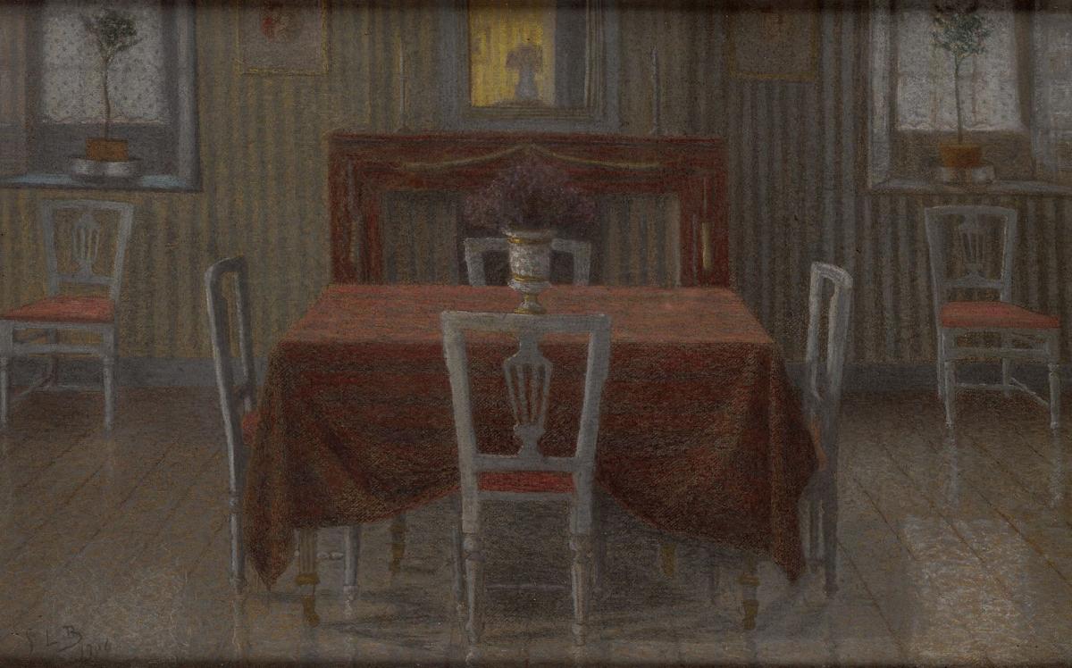 Based in the Belgian Fagnes, where he loves the vast, desolate expanses, Georges Le Brun finds his favourite subjects in rural settings or in depictions of interiors where human presence is scarce. This 1906 work is a fine example of his intimate style. He avoids any anecdotal or superfluous detail and focuses on the essential. The atmosphere of this Dining Room seems to exude the tranquillity and simplicity of country life. As with the painter Mellery, objects possess a soul and are not merely decorative. The use of pastel as a technique allows for a light dusting of colour that casts a muted, secretive luminosity across the scene.