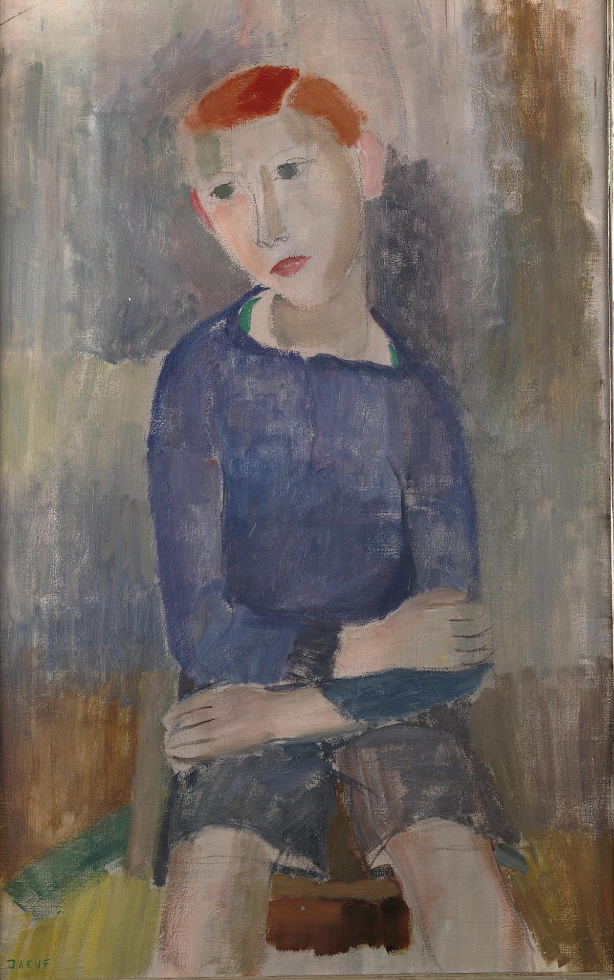 This portrait of a boy wearing a blue jumper, which gives the painting its title, was painted in 1929 by the Belgian artist Hippolyte Daeye. Having exhibited this *Chandail* at the famous Galerie du Centaure in 1930, Daeye was part of a vast artistic network, whilst developing his own distinctive style on the fringes. The catalogue of his retrospective at the Musée d’Ixelles describes the years 1929–1930 as ‘the most productive, and the most intense expression of a humble and simple truth’. The artist depicts babies, little girls and little boys individually. Sometimes his own children posed for him; here, it is the son of the housekeeper. Sitting on a chair, the red-haired boy has slumped shoulders, bent arms, bare knees and a distant gaze – a moving expression of a child’s innocence captured in his inner world, perhaps weary of ‘posing ’. The artist’s granddaughter, Bernadette De Visscher-D’Haeye, aptly described these ‘figures withdrawn into themselves (who) make no gesture, do not call out to us’. To convey this naturalness, this almost melancholic sensitivity, Daeye combines brushwork with a few supple, pronounced strokes, earning him comparisons with Modigliani, whose portraits of children Daeye admired, such as The Little Peasant in Blue (1918). For both painters, the so-called ‘primitive’ arts inspired a remarkable sense of synthesis, accompanied by a stylisation of the figure. In *The Blue Jumper*, the boy’s nose emerges from a long curved line, and two commas of green paint suffice to suggest his undershirt. The lightness of the brushwork contrasts with the impasto favoured by many of his contemporaries who, like him, sought great expressiveness, such as Permeke. Daeye further enhances the power of his portrait by opting for a background of ‘pure paint’, in shades close to those used for the model. Explored by Daeye since 1920, this type of abstract background helps to energise the composition, whilst drawing the eye to the figure.