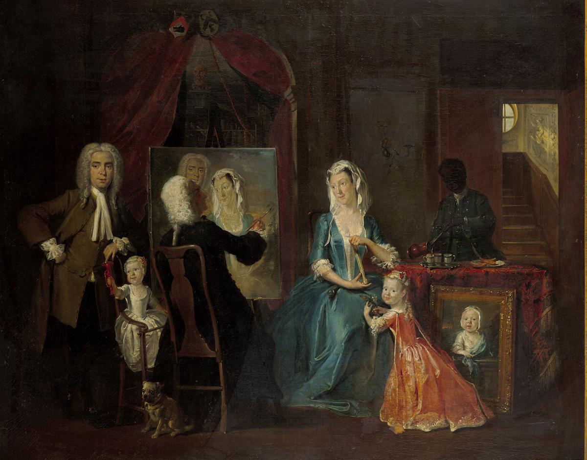 The Artist’s Studio is the work of one of the most famous Dutch artists of the 18th century, Cornelis Troost. This work can be interpreted on several levels: a reflection on the artist and his craft, a family portrait in the ‘Conversation Piece’ genre (in the style of Hogarth), and finally an allegory of the five senses. The composition centres on the artist himself, in the process of painting a portrait of a couple, creating a mise en abyme of a portrait within a portrait. The parents are accompanied by their children, captured in natural poses. The shimmering, luxurious gowns of the female figures brighten the scene and contrast with the harmonious shades of brown and ochre. Certain details highlight the artist’s social success: behind the painting, a bookcase can be seen; to the right, a servant is serving a drink; and finally, the door opens onto a stairwell whose walls are adorned with rich decorations. The representation of the five senses, developed by Aristotle (whose bust is no doubt visible in the bookcase), is illustrated in the details: the trumpet held by the child evokes hearing; the pug at the foot of the chair, touch; smell is found in the flowers held by the other little girl; taste is symbolised by the chocolate poured into the cups; and finally, the painting of the couple and the painter watching them represents sight, an essential sense for the artist.