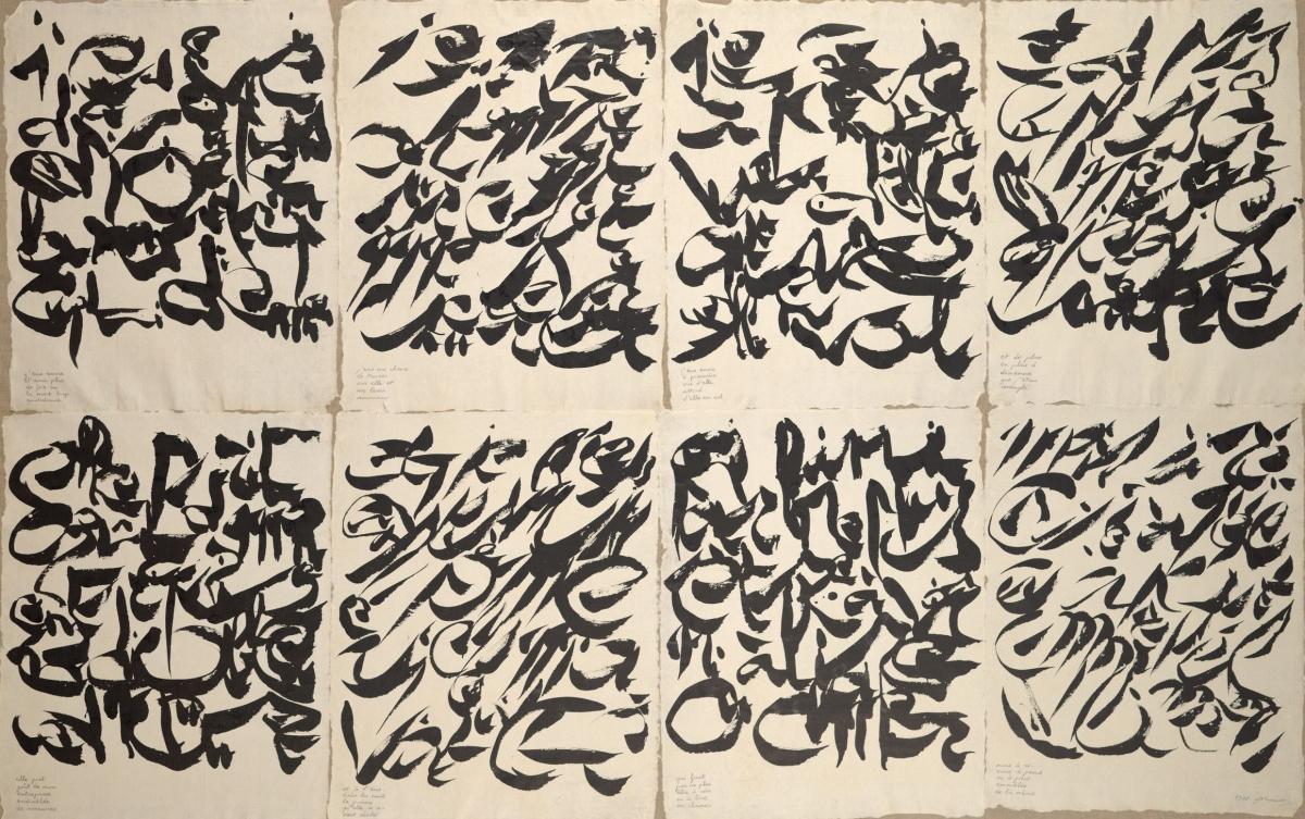 Christian Dotremont, a poet, writer and visual artist, was one of the principal founders of the Cobra Group (named after Copenhagen, Brussels and Amsterdam, the cities from which most of the artists hailed), which championed collective experimentation. In the aftermath of the Second World War, this group displayed a preference for naïve and folk art, Oriental and Chinese calligraphy, non-European art, and children’s drawings. In 1948, together with the Danish artist Asger Jorn, Dotremont created the first ‘word-painting’: the painter and the poet occupy the canvas simultaneously or alternately. A trip to Lapland and its vast snowy expanses would prove decisive in the subsequent development of his artistic career. This snow becomes the blank page and the black ink is the mark traced upon it. In 1962, the artist created the logogram, a fusion of word and drawing that causes language to vanish. The logograms (which he wished to call ‘anti-calligraphy’ to emphasise their illegibility) are sometimes accompanied by poems, as in this work comprising eight sheets of Japanese paper on which the logogram is juxtaposed with a short love poem. His exploration of writing led him, alongside his work as a writer, to the graphic poem that is the logogram.