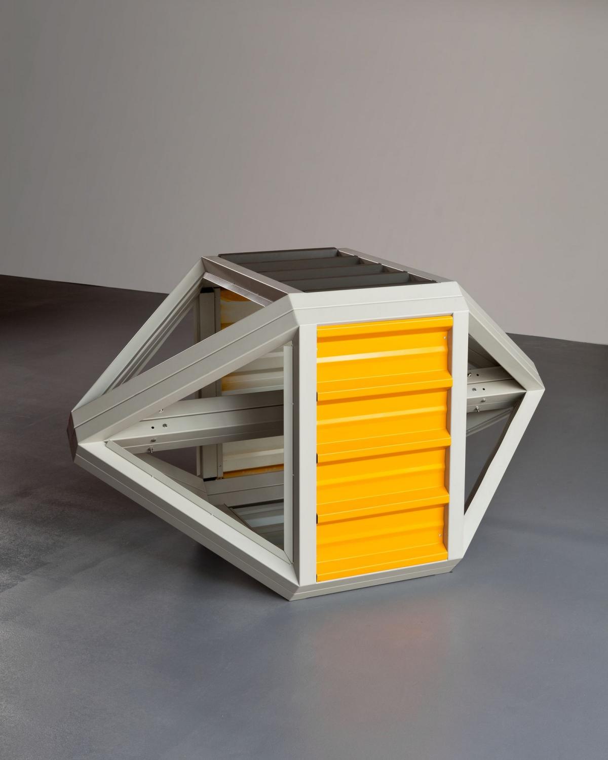 To create *Modern Industrial Units*, Xavier Mary makes use of industrial materials such as these galvanised profiled steel sheets, which are typically used as motorway barriers. In the manner of Duchamp, he removes objects from their utilitarian context and imbues them with artistic value. But this is not his only artistic influence; the work features graphic interplay of lines reminiscent of American minimalism. The sculpture also features diamond-pointed edges, as if playing on the contrast between the precious and the raw. Xavier Mary creates a kind of aesthetic syncretism, blending past and present within a resolutely contemporary language.