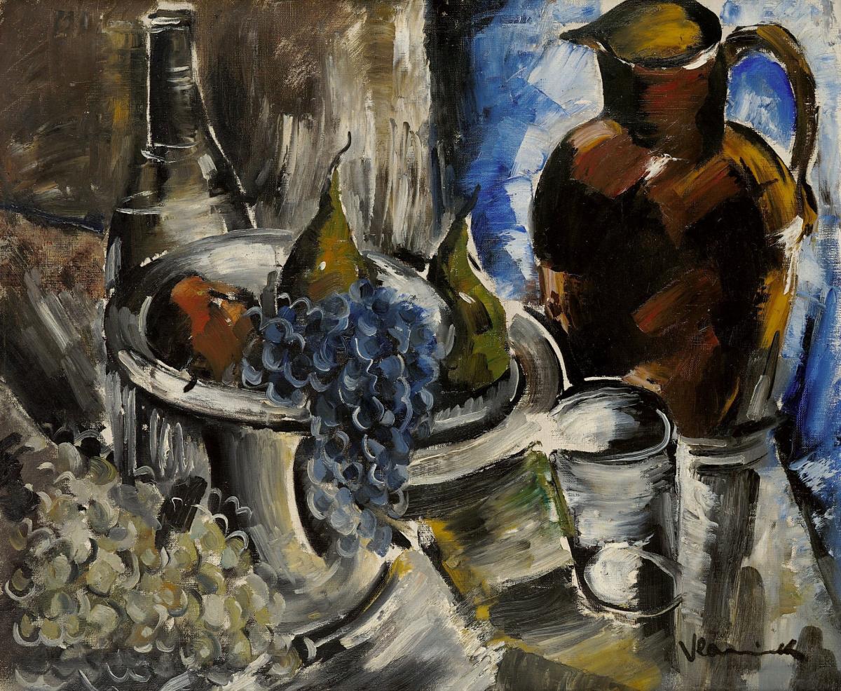 In the 1930s, whilst living in Eure-et-Loir (France), Maurice de Vlaminck painted landscapes, flowers and still lifes. Critics of the time regarded the artist’s final years as the most intense period of his creative output. Here, on a corner of a rustic table, a stoneware beehive, a few glasses, a bowl of fruit and a bottle make up the elements of this still life. They are swiftly rendered with varied brushstrokes that structure their surfaces into areas of differing light intensities. The muted palette and the black outlines of the objects accentuate the austerity of the work. Vlaminck continued to paint until his death, using the same forceful impasto to create landscapes in broken tones from which all the brilliance of his early Fauvism had faded.