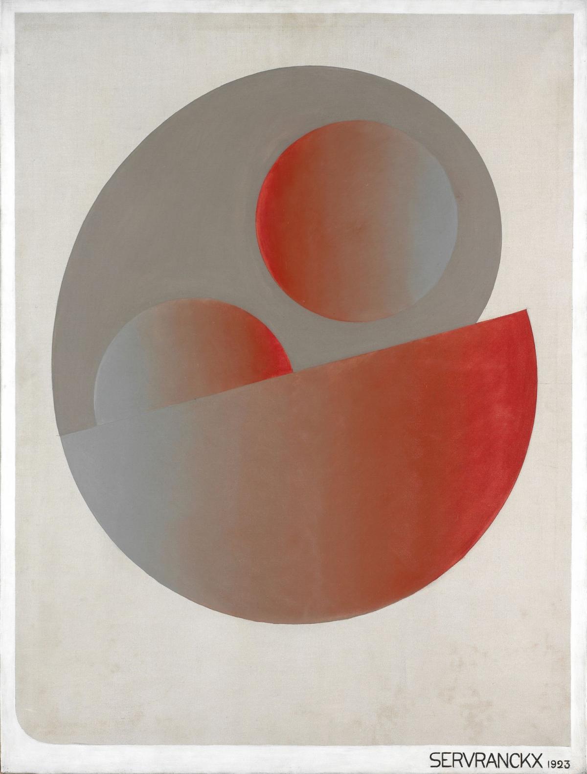 Against a gradient of grey and red, several circles—some whole, some halved—collide. One might see in it a painter’s palette, or planets clustered with their moons. The painting also evokes depictions of machines, such as those painted by Fernand Léger. It is, in fact, a purely plastic composition evoking the industrial world. The idea is no longer to draw inspiration from a real motif, but to create universal abstract art. When Victor Servranckx created Opus 53, so named as it was his 53rd work, he was just 26 years old. In the wake of the First World War, he reacted, alongside others such as Jozef Peeters and Prosper De Troyer, to the gentrification of painting. Like them, he aspired to ‘Pure Plastic Art’. The ideas of this small group of artists were publicised by the Belgian magazine 7 arts, whose first issue contained the manifesto of the Constructivist movement. It stated that ‘art is an active experience of civilisation’. The art they advocated was intended to be universal and understood by all, for, according to Servranckx, “Geometric laws are what connect people; they are the platform where all people can meet; they are common ground for a possible collective art. Geometric form excludes particularistic individualism…”.
