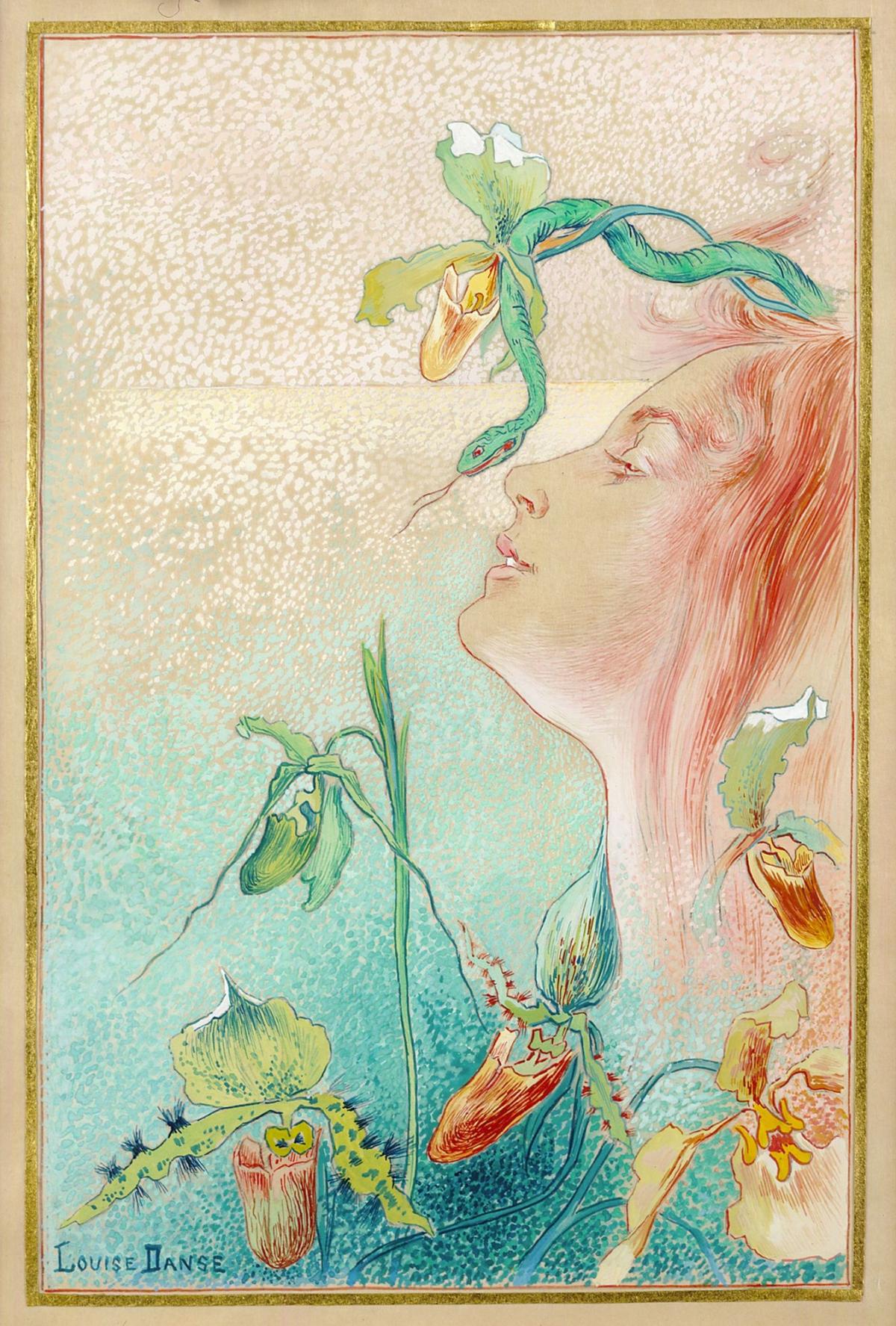 Louise Danse was trained in the arts by her father, the Brussels-based engraver Auguste Danse. A member of the Société des Aquafortistes Belges and the L’Estampe group, she left behind a body of drawings and engravings, including this watercolour, which was bequeathed to the museum by Octave Maus, a leading figure of the Belgian fin-de-siècle. Produced around 1900, Orchids is representative of the Art Nouveau style then in vogue. Celebrating organic forms, this movement suggests an osmosis between plants, animals and man – or rather, in the context of Art Nouveau, woman.As is often the case, Louise Danse depicts her subject in profile, so as to emphasise the sinuous line of her neck and face. With her head tilted back, her eyelids half-closed and her full lips, her expression is sensual and voluptuous. But the attentive viewer will notice a snake emerging from her skull, ready to spit its venom – could this slender figure be a Gorgon in the making? A contemporary critic, Judith Cladel, certainly recognises the emblematic femme fatale of the fin-de-siècle in Danse’s work, when she describes “these snakes (which) project their forked fangs towards the rosy lips of nymphs, sisters of Salammbô with their ingenuous perversity”. The snake coils around the stem of an orchid, an exotic plant also favoured by other Art Nouveau artists, such as Emile Gallé and Louis Majorelle. Its flowers invade the figure and nestle in her hair – flora and woman become one, in a ballet of undulating lines. The composition is highly decorative, an effect further heightened by the iridescent background of small orange and turquoise touches, and the inclusion of the watercolour within a pink fabric mat, complemented by an ornamental frame.
