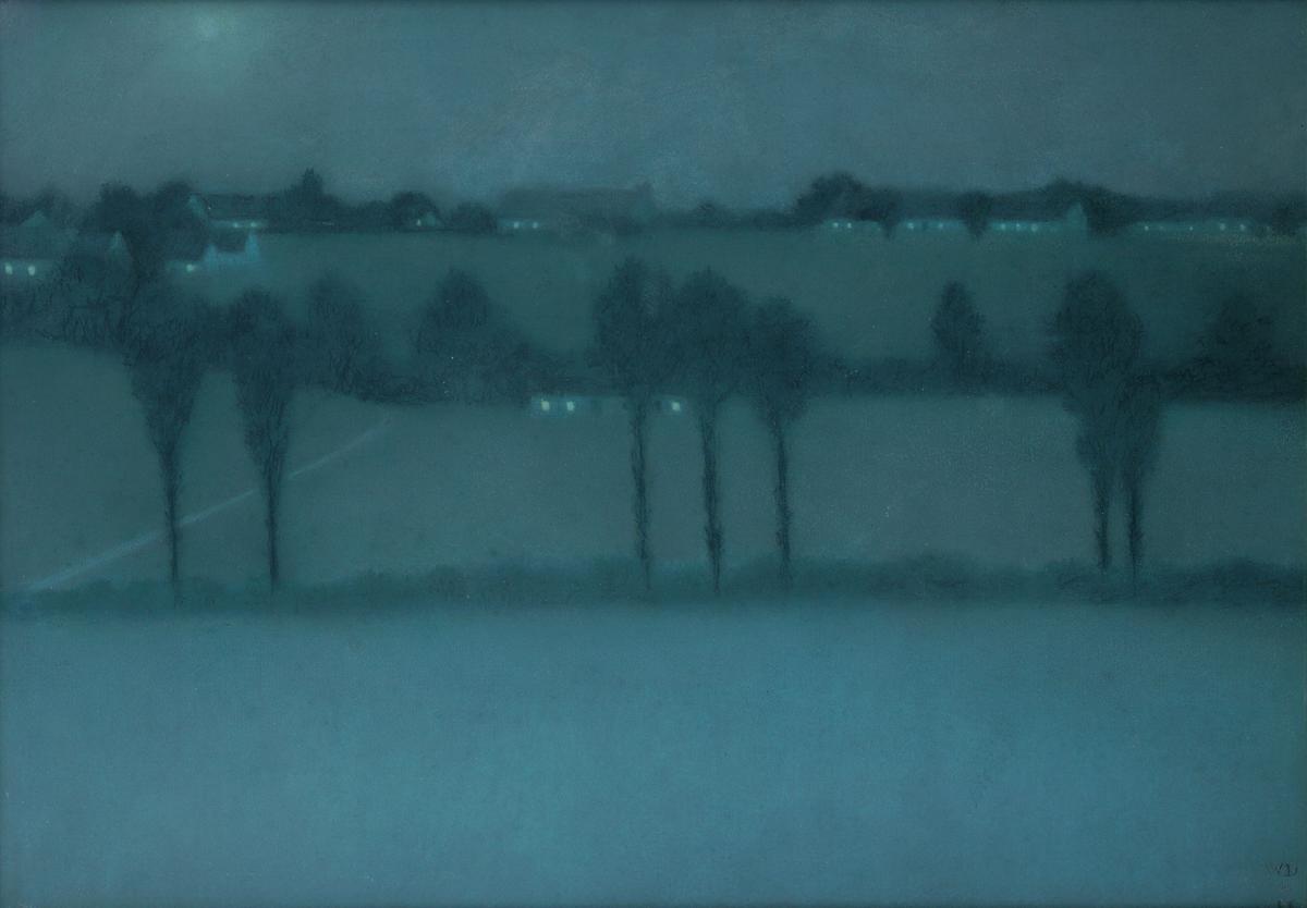 This *Night Scene* from 1896 is typical of the nocturnal scenes that were then occupying the artist William Degouve De Nuncques. In the late 1890s, the artist produced several views of plains, parks or forests, all monochrome as they are bathed in the same twilight. Whilst he occasionally included peacocks or swans in these scenes, Degouve favoured landscapes devoid of any figures. Here, human presence is merely suggested through the lights of the houses dotting what is likely the Brabant landscape, which Degouve enjoyed revisiting between his travels abroad. As the title suggests, however, the artist does not anchor his depiction in a specific environment. On the contrary, he seeks to transcend reality through the expression—both more personal and more universal—of an atmosphere as perceived by an individual. Through the blurring of contours, the nocturnal scene is employed as a poetic means of derealisation, as art historian Denis Laoureux has explained. The choice of pastel is significant in this regard: light and airy, pastel lends itself to evoking a vision shrouded in blue mist. Through such preferences, Degouve aligns himself with fin-de-siècle Symbolism, propagated in Europe notably by the Belgian avant-garde movements of the 1900s and the Libre Esthétique – indeed, the artist would later present this *Effet de nuit* to the leading figure of these movements, Octave Maus. Other artists creating nocturnes, such as the American James McNeil Whistler, gravitated around these circles. Degouve’s approach, however, differs from that of Whistler, whose nocturnes often spring from informal bursts of colour, whereas Degouve creates the evocative yet refined world of *Effet de nuit* through an almost Cartesian arrangement of horizontal and vertical lines. The artist summed up his approach as follows: “To paint a picture, one need only take some colours, draw some lines and fill the rest with feeling.”
