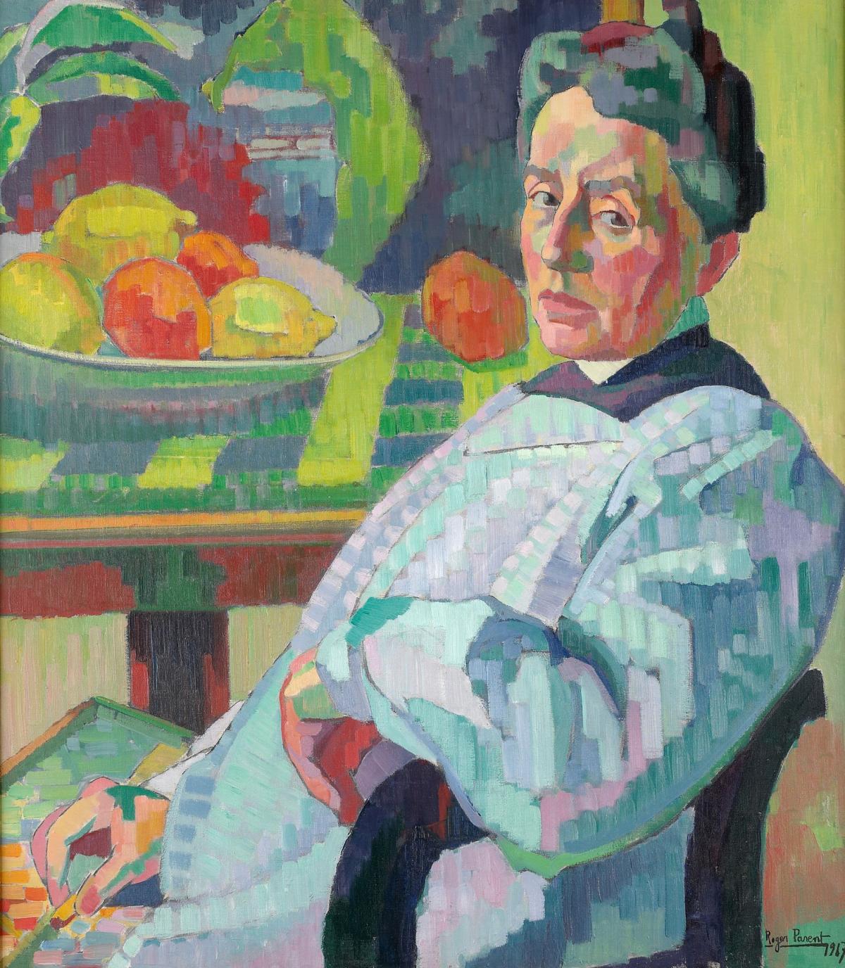 During the First World War, Roger Parent (1881–1985), a Frenchman living in Brussels, was put up in the capital by Berthe Art. She was a still-life painter. The elderly lady gave drawing and watercolour lessons to young ladies from high society, to whom Parent sold sketches for just five francs each. He also became their teacher, charging twenty francs per session. In this fine portrait of the painter (sometimes mistaken for a portrait of Anna Boch), he depicts her holding a pastel, whilst behind a table, details of a painting can be seen. The framing of the scene and the vivid colours betray the influence of Fauvism, but the pictorial touch, often defined by geometric shapes, recalls the influence of Cézanne.