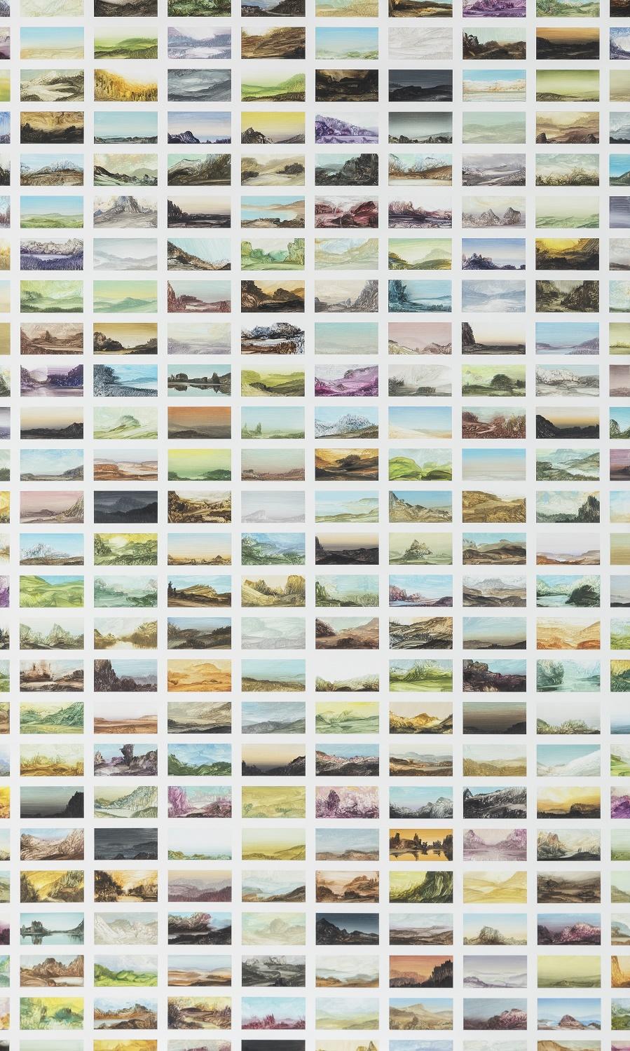 Stefan Peters’ approach forms part of a reflection on painting itself, in relation to the digital image culture in which we are immersed. The work is part of the ‘Chronicles’ series, which explores the theme of landscape. On a wooden panel, the artist uses acrylics to develop the infinite possibilities offered by the landscape. In postcard format, the views are multiplied. They all embody ‘possible’ landscape paintings, each of which could have become an independent work. These possibilities are not confined: the scenes bordering the frame are cut off, as if to signify that they extend beyond. Peters catalogues them within a grid, in an almost scientific or photographic manner. In the West, the tradition of landscape painting took root when artists such as Joachim Patenier, in the early 16th century, began to treat the landscape as a subject in its own right. The artist continues this tradition by putting it into perspective, but also by situating it within our digital age (as evidenced by his series based on images extracted from Google Earth).