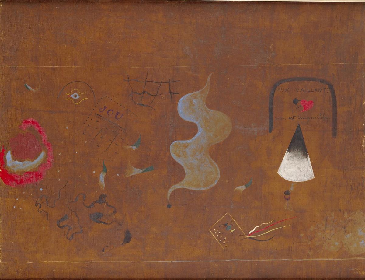Deeply moved by his discovery of the Surrealists in Paris in the early 1920s, the Catalan painter and sculptor Joan Miró (1893–1983) abandoned the precise realism he had practised until then in 1924, turning instead to paintings imbued with dreamlike quality and mystery. *Head of a Smoker* bears witness to his first steps in this new phase of his artistic career, influenced by Surrealist innovations such as fragmentation and the juxtaposition of unexpected images. Miró thus offers the viewer a new, rather playful visual language, presenting a multitude of clues to be deciphered. In a composition reminiscent of cave art, various elements and traces float enigmatically against a brown background, with no apparent connection or narrative logic. Yet, taken together, they provide us with valuable clues as to the work’s symbolism. The artist echoes the ancient myth of the Minotaur, a creature half-man, half-bull, whose white horns with black tips are recognisable. The grid serves as a metaphor for the labyrinth in which the monster was imprisoned, whilst the winding black thread represents Ariadne’s thread, which enabled her and the hero Theseus to escape from this giant arena. The maxim ‘To valiant hearts, nothing is impossible’ pays tribute to their courage and love, in the form of a rebus depicting two intertwined hearts. This integration of writing into a painted work is part of the continuation of the Dadaist experiments with which Miró was well acquainted. This revolutionary artistic movement, which emerged in 1915, sought to overturn the traditional codes of art, much like Surrealism. It is worth noting that the myth of the Minotaur was particularly favoured by his friend Pablo Picasso and by the Surrealist movement, which would indeed use it as the title of a magazine from 1933 onwards. The Catalan artist’s work joined the collections of the Musée d’Ixelles in 1977 through a ‘happy accident’, a museum primarily dedicated to Belgian art. Credit for this goes to the Ixelles-based art dealer and collector Marc Janlet, who bequeathed several exceptional works, including another by Miró, *The Circus Horse* (1927).