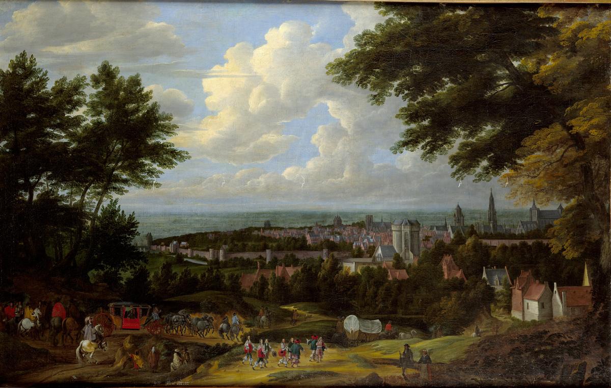 In the tradition of the urban scenes that the Flemish Primitives used as a backdrop for their sacred scenes, Baudewijns presents us here with a panorama of Brussels viewed from the heights of the Saint-Gilles suburb, likely dating from the late 17th century. In the foreground of the painting, a company of gentlemen, a carriage and a colourful escort enliven the landscape, which is rendered in more subdued tones. In the middle ground, the city of Brussels unfolds, with Saint Nicholas’s Church, the belfry, the tower of the Town Hall and Saint Gudula’s Church to the right. Finally, the massive tower of the Porte de Hal stands imposing amidst the ramparts. The artist plays with the tree-covered masses and orchestrates the different planes to convey the perspective. The atmospheric rendering of nature lends unity to the whole and attests to Rubens’ influence on the painter.